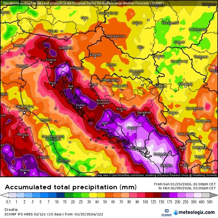 Prema najnovijim meteorološkim prognozama, razdoblje od 28. siječnja do 8. veljače 2026. godine donosi izrazito nepovoljne vremenske prilike na širem području regije, uz mogućnost obilnih i dugotrajnih oborina.